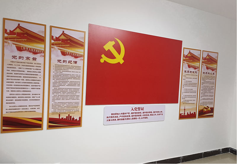 新街巷黨支部陣地建設由黨員活動室、辦公室一樓、二樓、三樓樓梯和二樓、三樓樓道走廊組成支部文化墻。黨員活動室的創(chuàng)建嚴格按照黨建標準化要求:建設專屬黨支部活動室,有場所、有設施、有標志、有黨旗、有書報、有制度,在活動室內(nèi)醒目位置懸掛黨旗,并將入黨誓詞、黨員權利和義務、黨支部組織機構和職責等上墻。